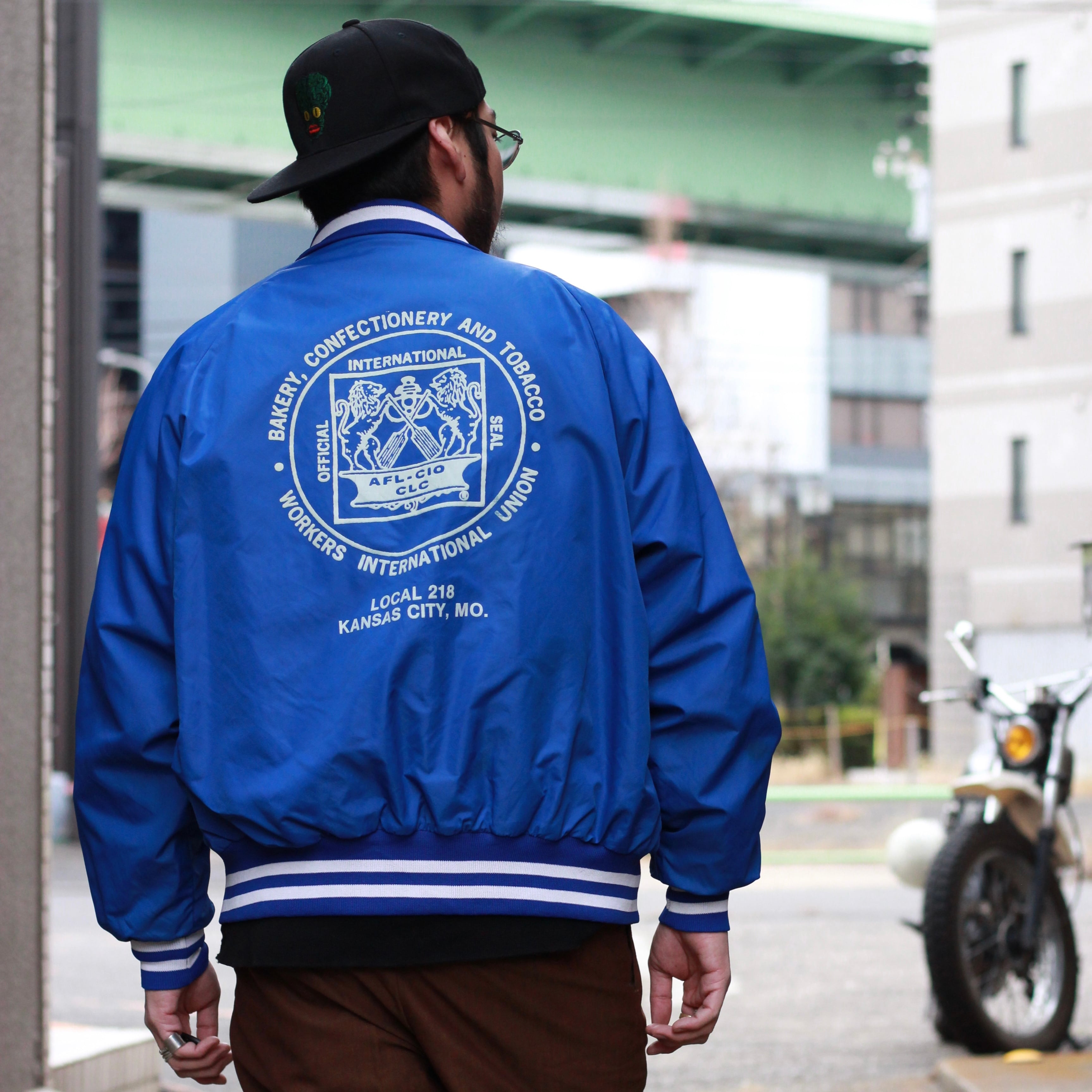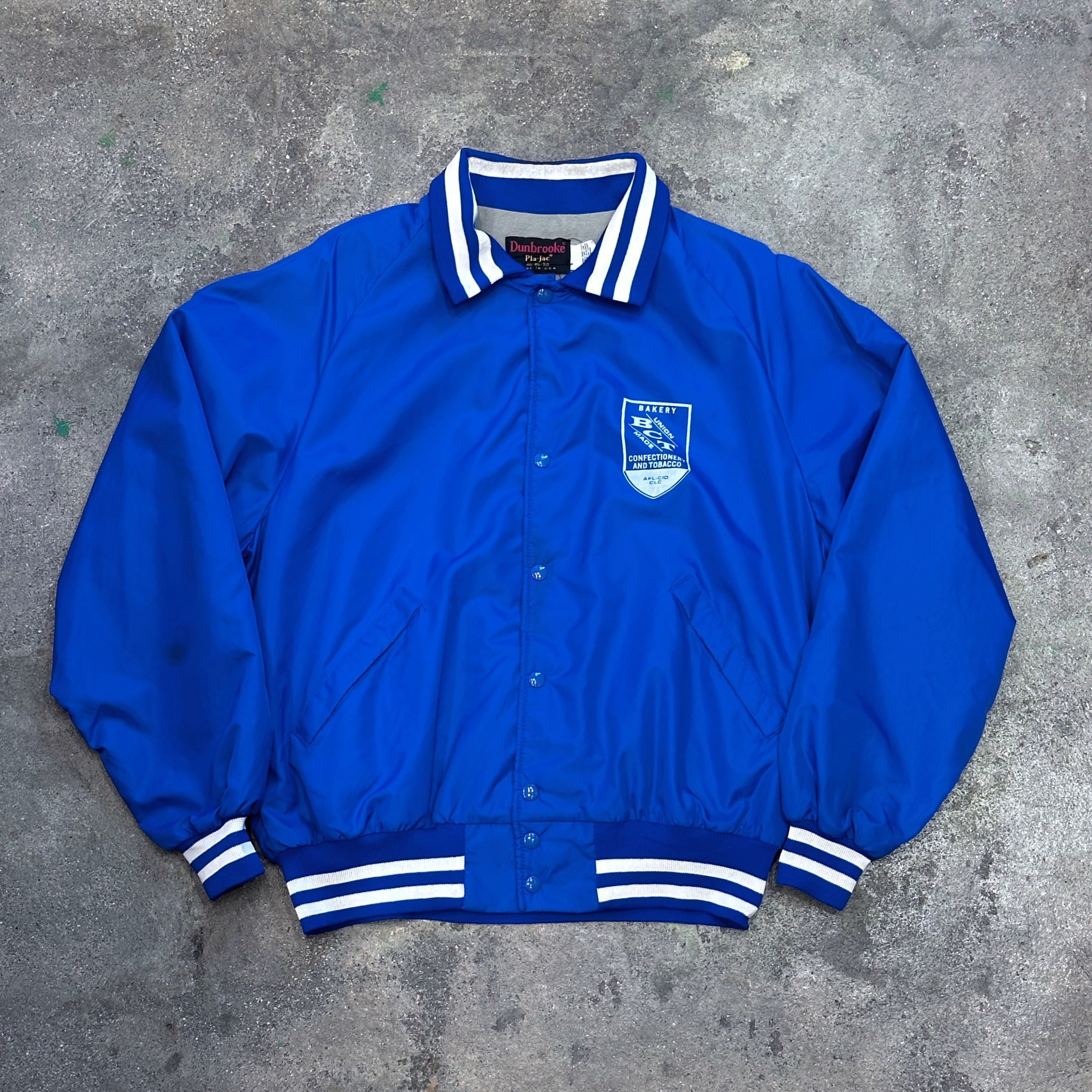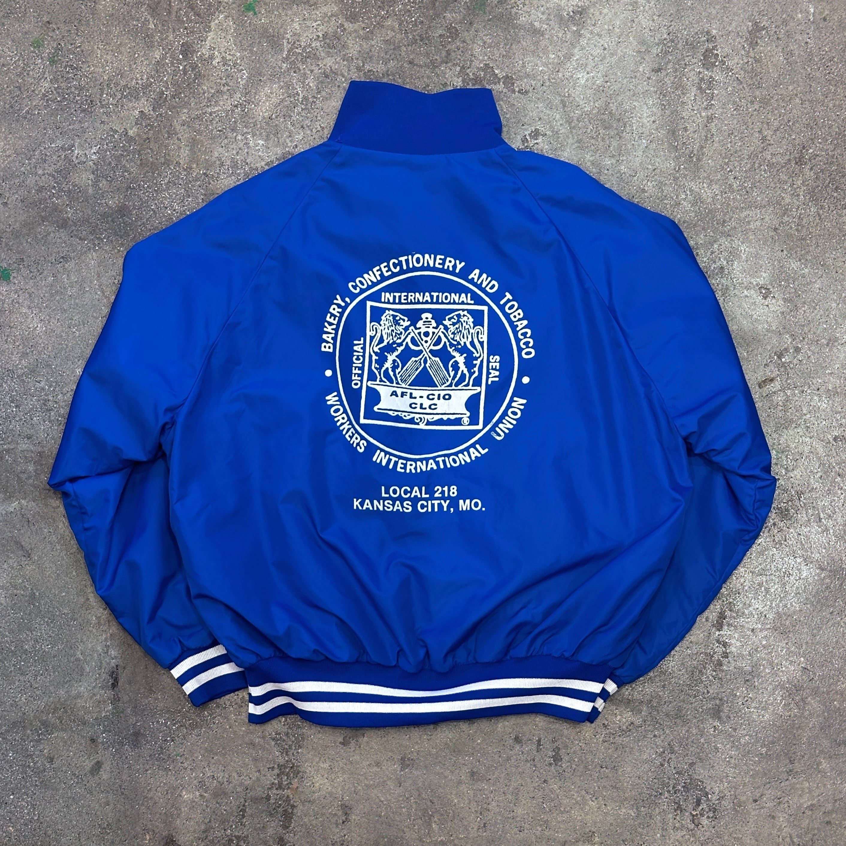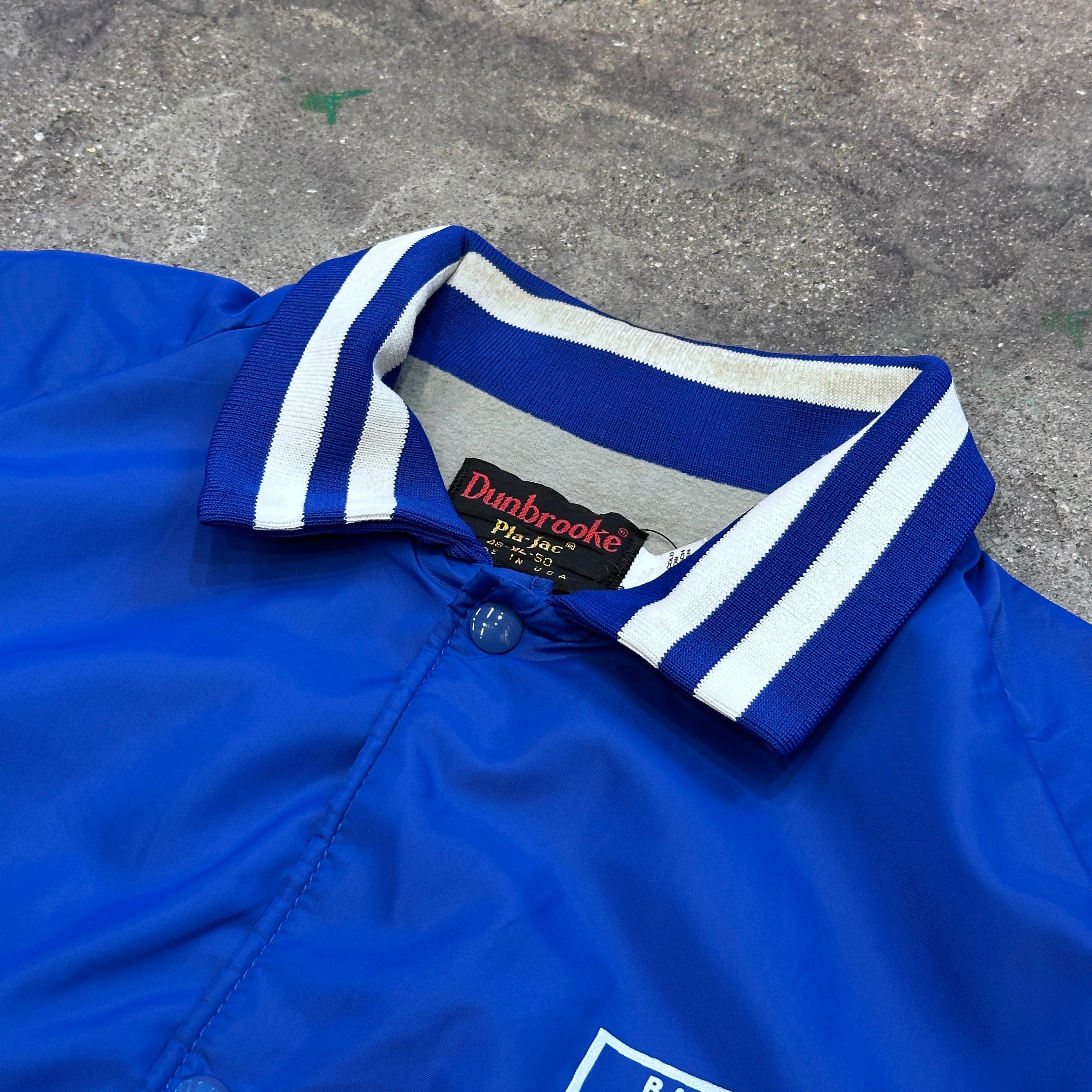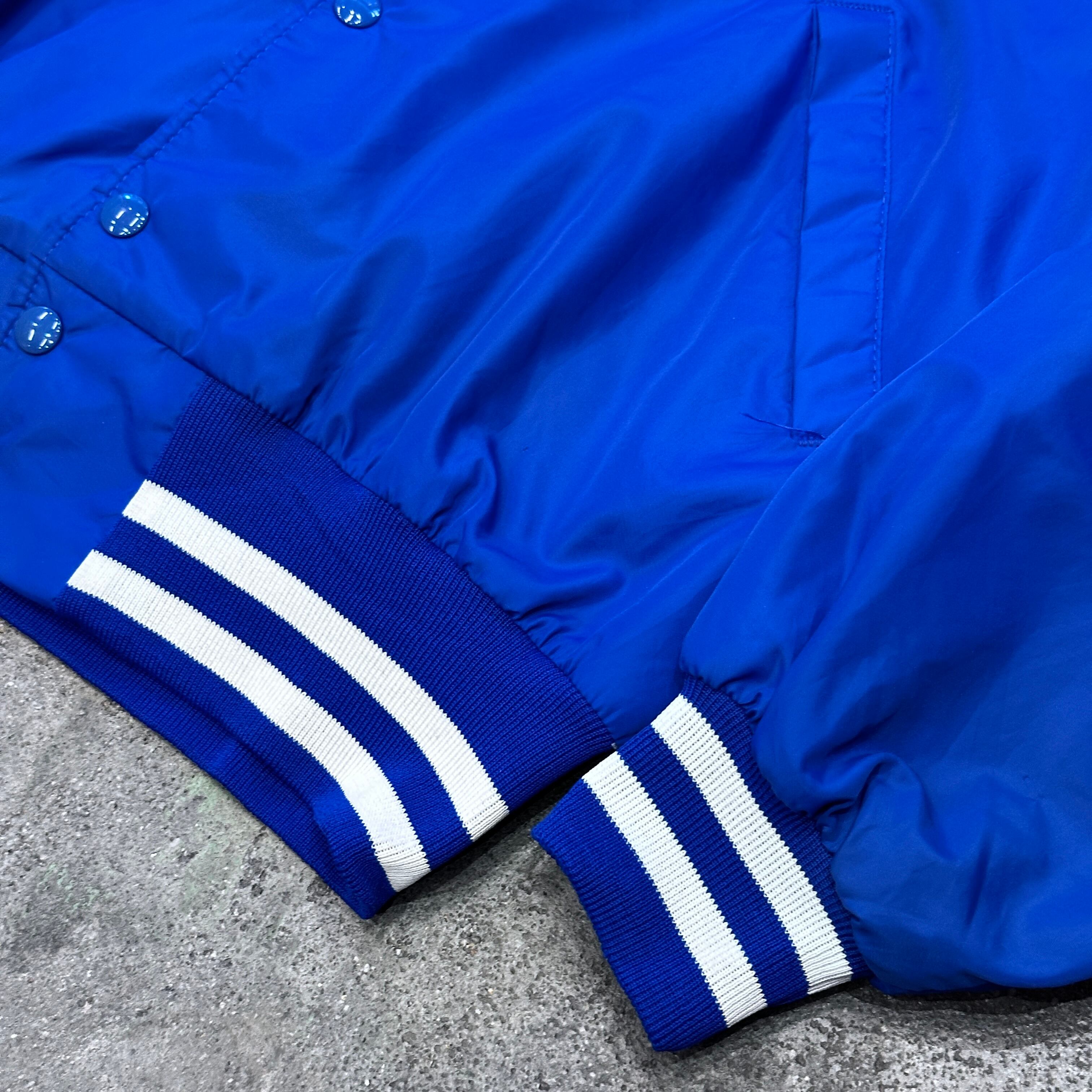 鮮やかなブルーのナイロンジャケット。